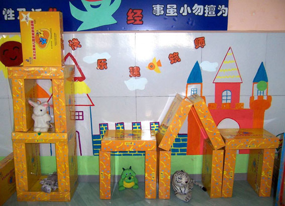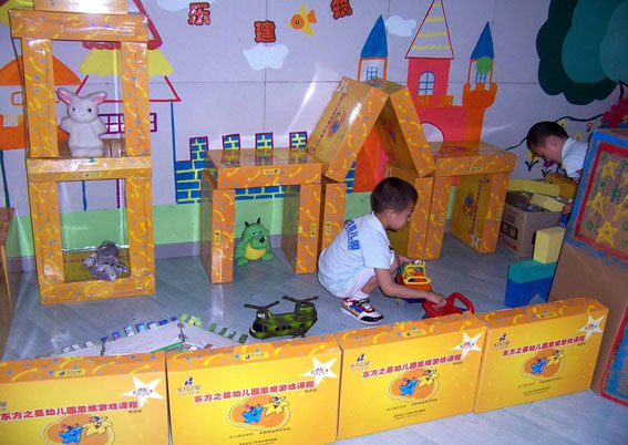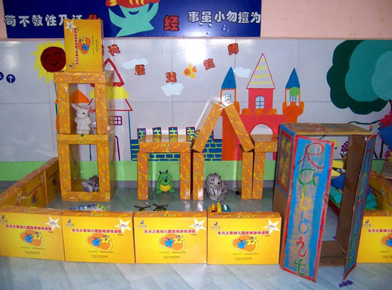 活动区布置,巧妙利用了,思维游戏课程的包装盒搭建出各种立体图形,设计理念简单、实用。