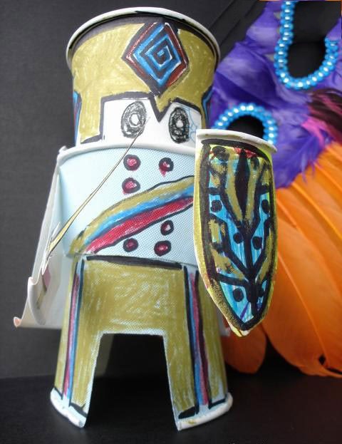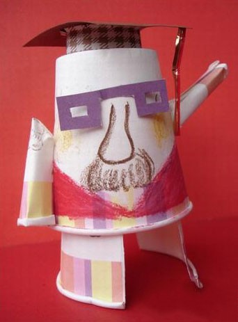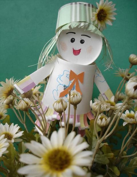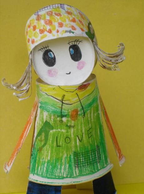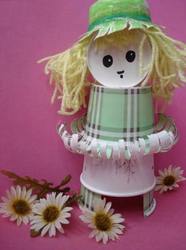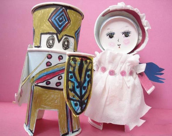 3、利用纸杯上现成的图案,给娃娃画上衣领、袖子以及小手;或从纸杯上剪一块并贴在纸杯娃娃身上,并绘上颜色;